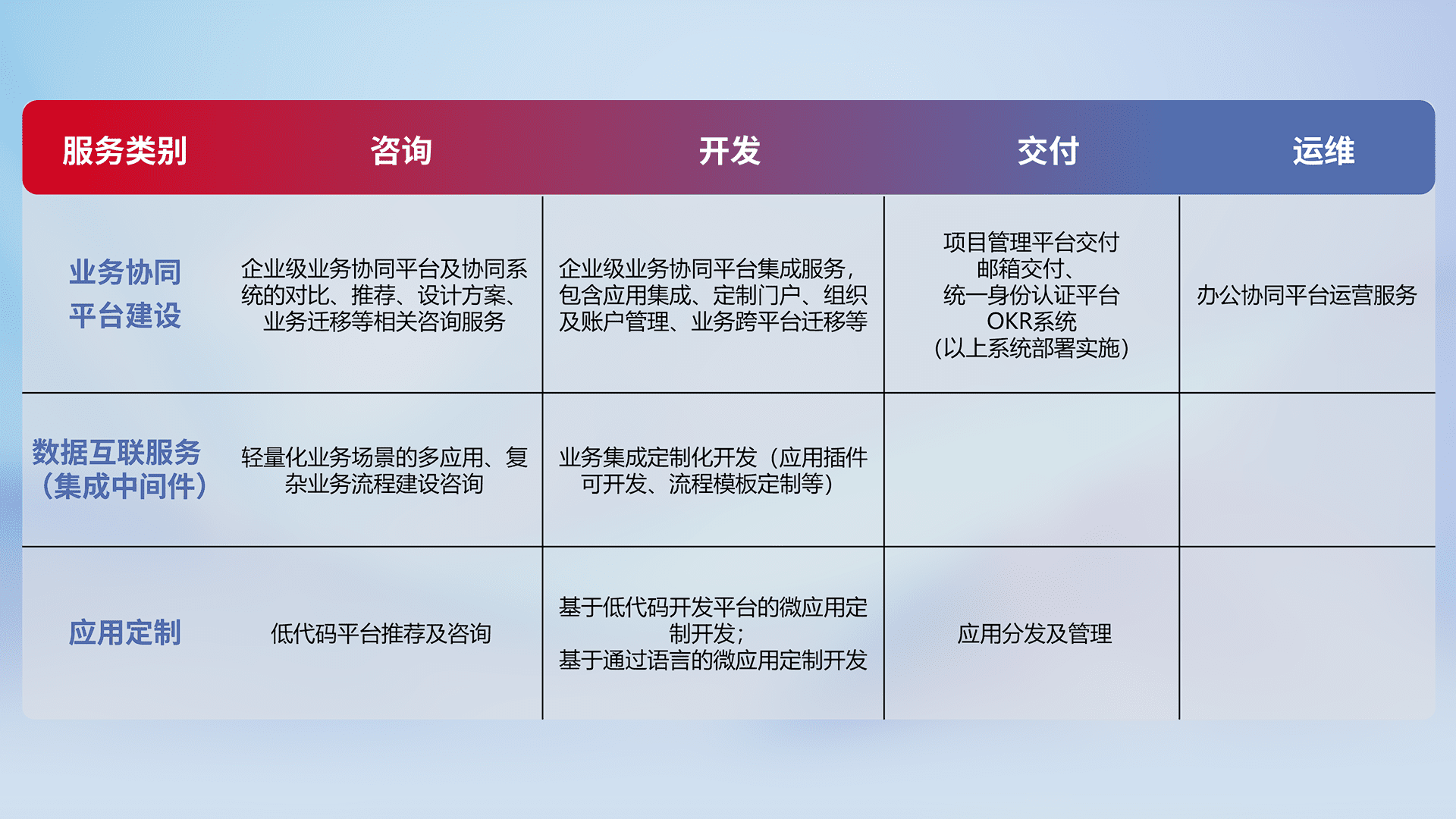 针对钉钉、、、企微、、、、IDaas等平台级产品提供产品的规划、、方案、、、、交付、、定制化开发等服务,,实现如统一协同办公、、、智能客户服务、、、、混合会议管理、、、、智能数据查询、、、等业务场景,,,,实现数字化转型。。。。