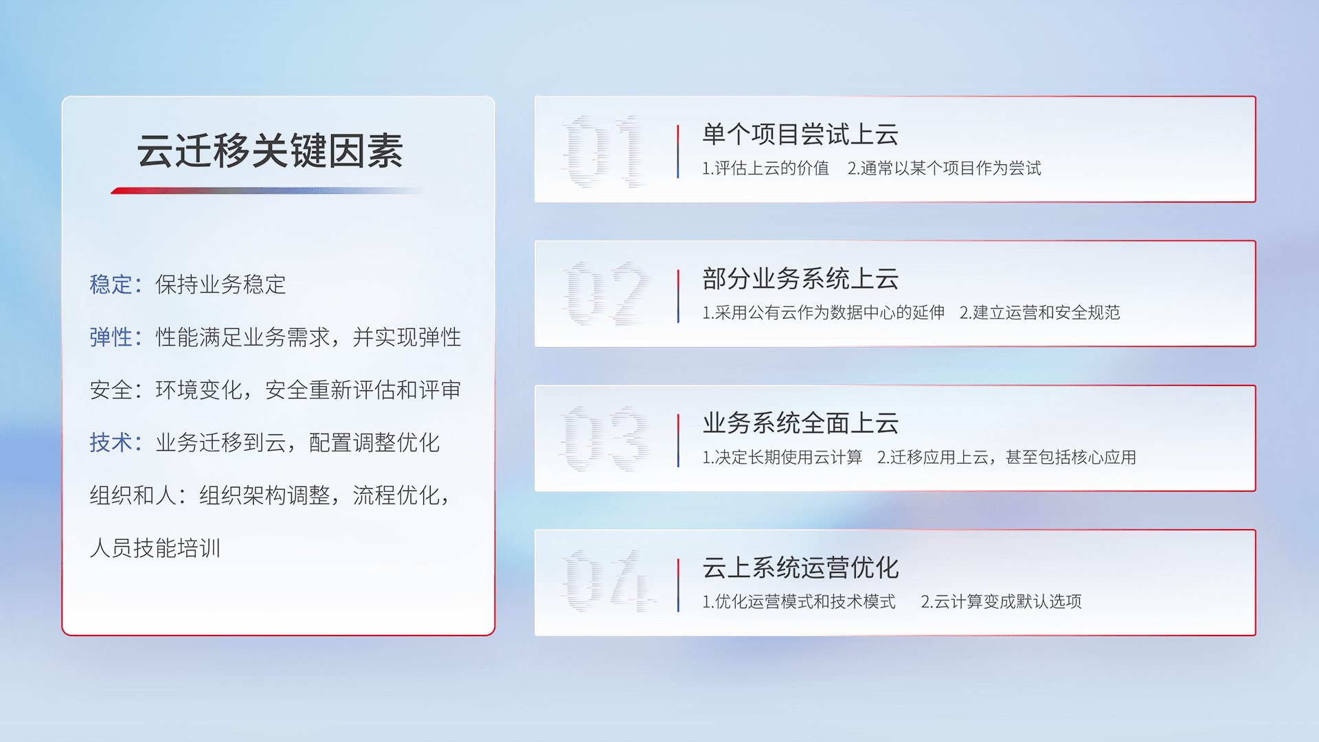 结合实际业务,,,,从规划设计、、云平台选型、、、、云原生改造、、、、数据迁移、、、集成交付,,,迁移全过程为客户识别最佳上云路径,,做好风险识别管理,,设计网络架构、、、身份权限、、安全审计合规、、操作审计、、、日志审计、、、、监控告警策略、、、、多站点容灾设计等,,对云上基础设施进行整体规划,,提升IT治理水平,,以满足弹性、、高可用、、高性能的需求。。。