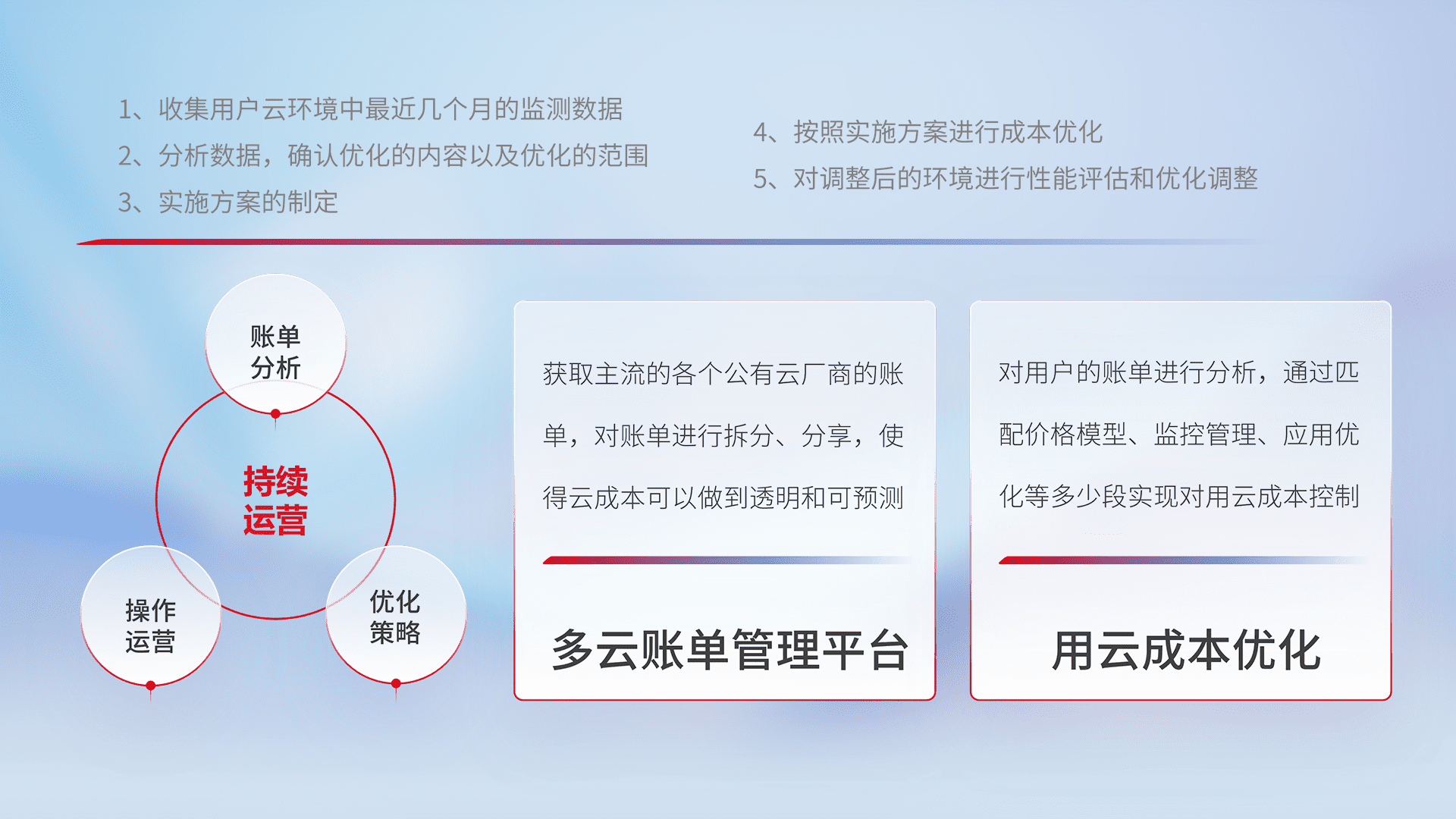 通过多云纳管,,,,以统一的资源数据模型把客户的云资源进行抽象和封装,,,,进而实现对多云资源的统一操作,,保障云资源管理的可靠性、、、稳定性与可用性。。量身定制化运维内容,,配置、、、开发运维、、补丁管理、、、备份、、监控、、、、认证和访问管理、、、审计和日常巡检等,,保障在用云过程中的可靠度,,,,稳定度以及高可用率。。。